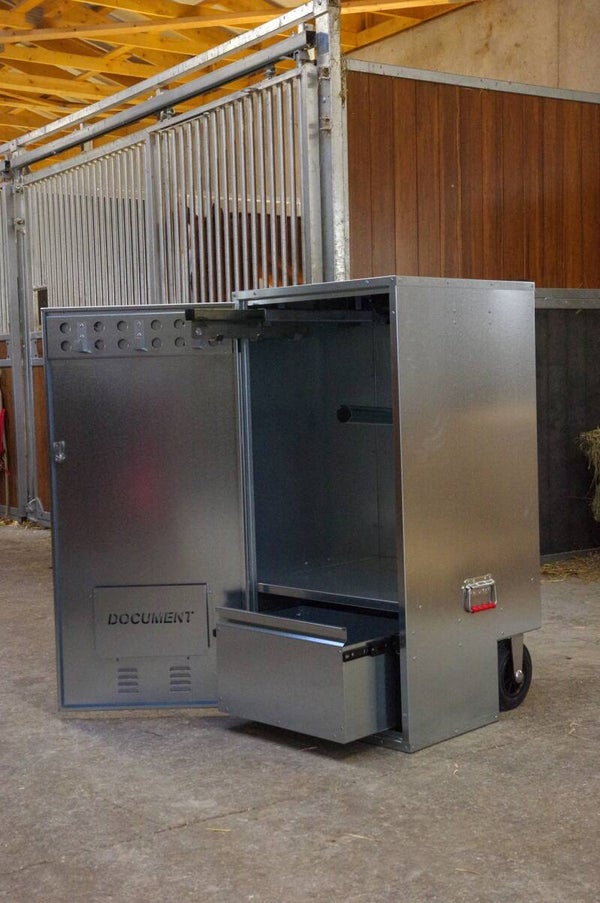 La cabriolet, dotée de ses 2 roues, est notre entrée de gamme en terme de malle d'équitation.  Son ergonomie et ses dimensions lui permettont de vous accompagner facilement sur les terrains de concours, en s'intégrant dans vos moyens de transport (van ou camion).